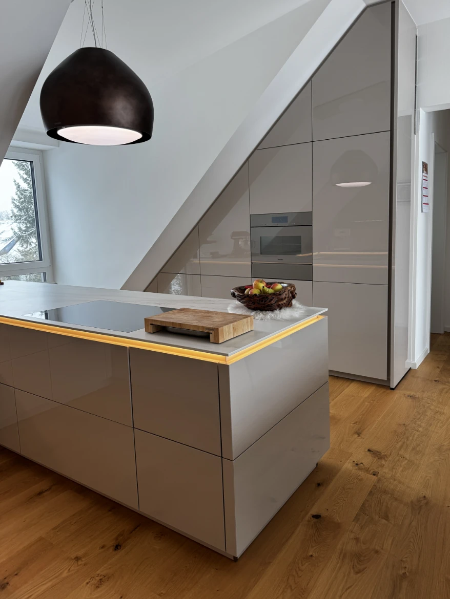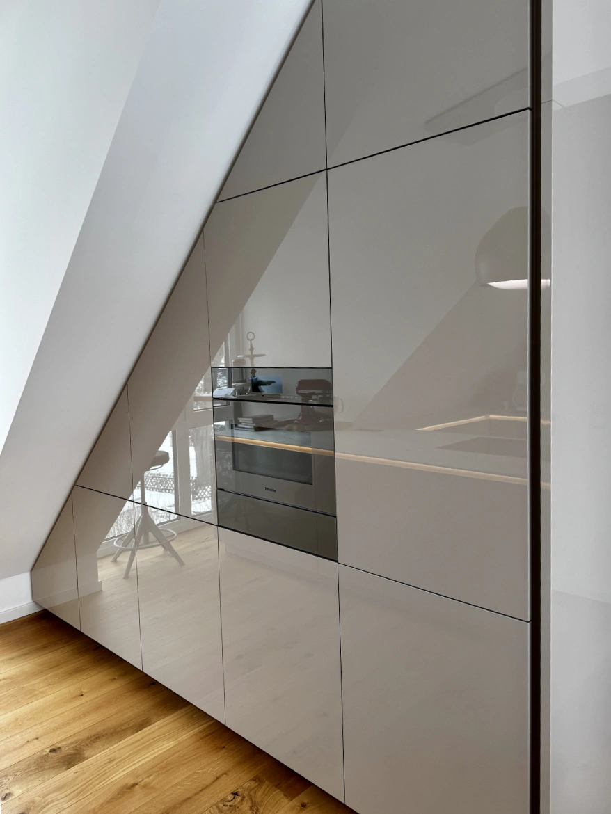 Ergänzt wird die Küche durch eine maßgefertigte Hochschrankwand, die speziell an die Schräge angepasst wurde – eine Sonderanfertigung, die Funktionalität und Ästhetik miteinander verbindet.
