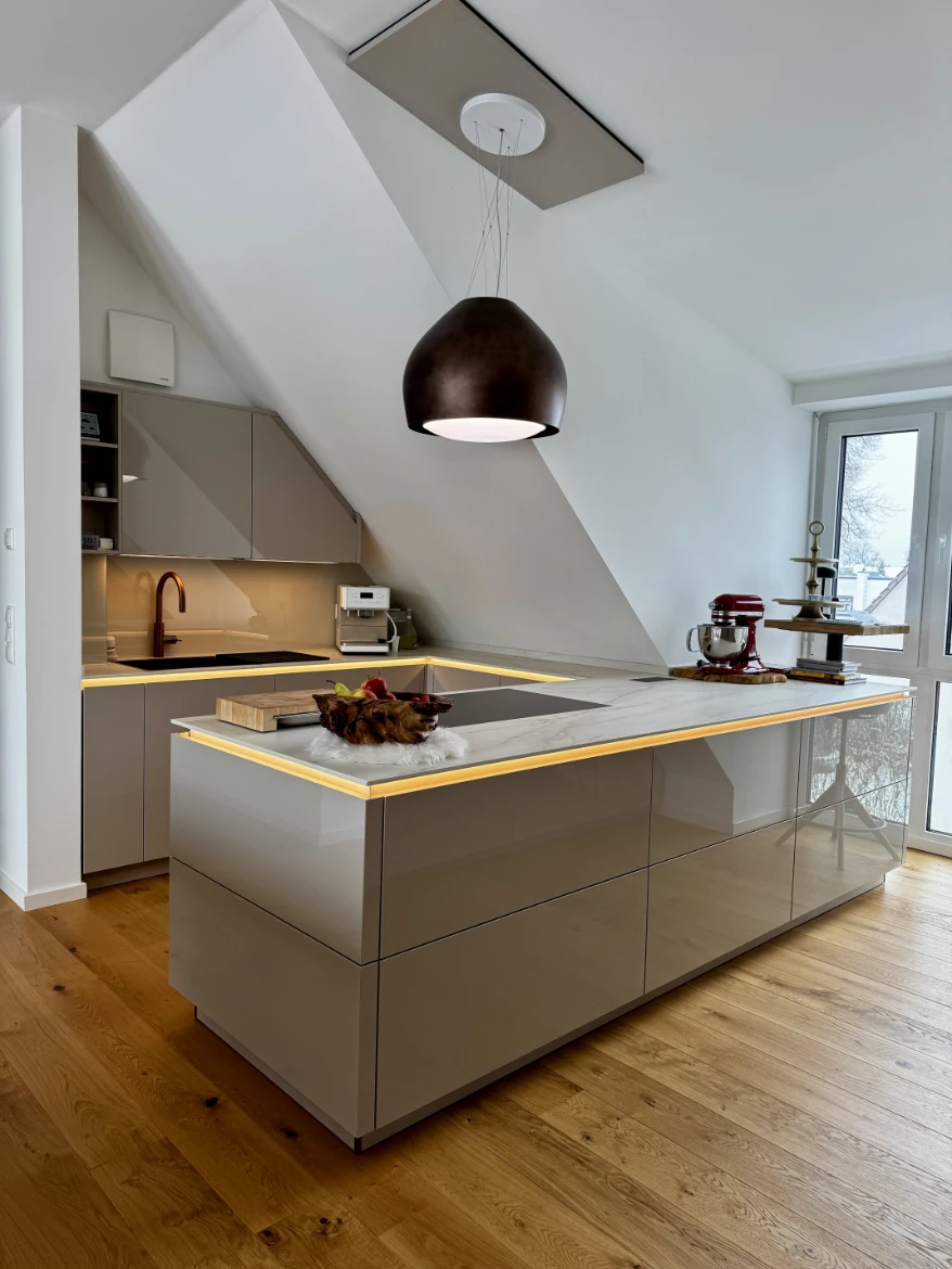 Die größte Herausforderung bei diesem Projekt waren die vorhandenen Dachschrägen. Um den Raum optimal zu nutzen, wurde der Trockenbau bewusst vorgezogen und die Küche frühzeitig in die Planung integriert.