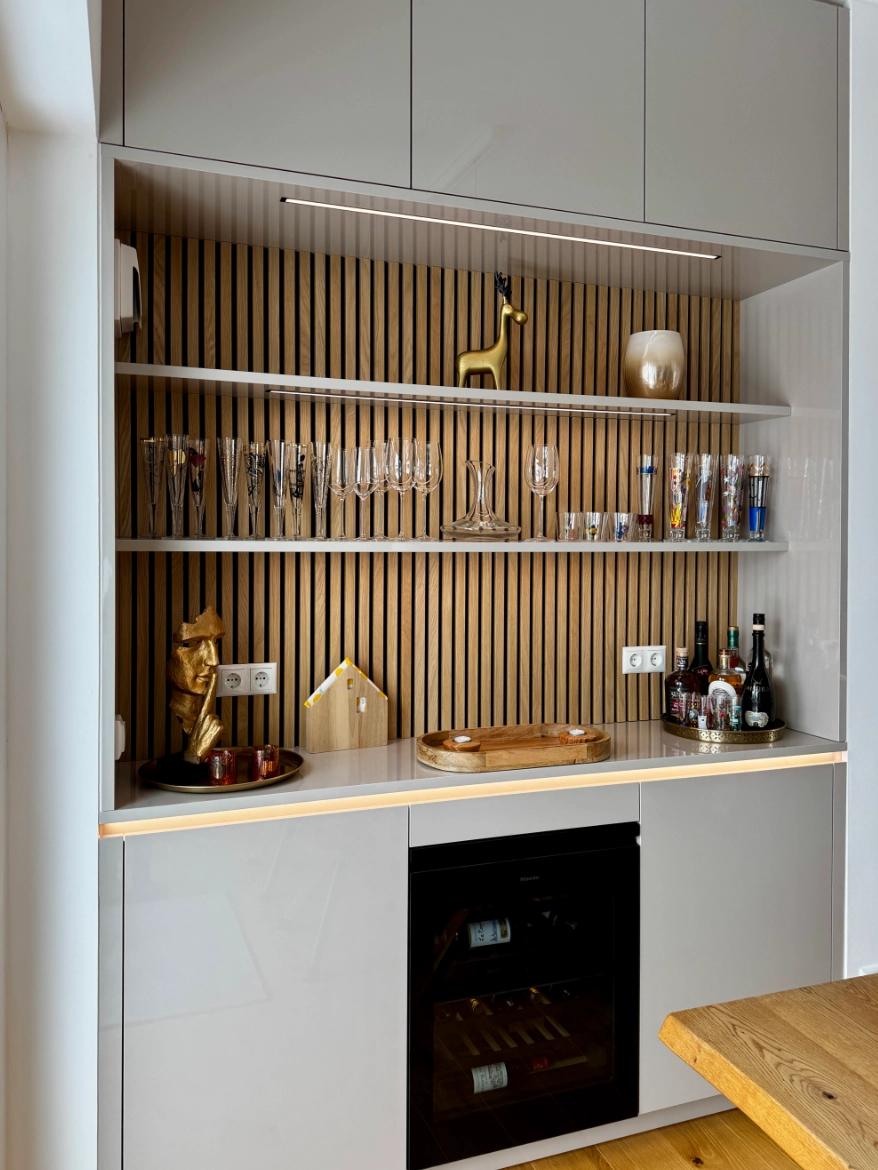 Durch die Kombination der Küchenmöbel mit wohnlichen Paneelen entsteht ein harmonisches Gesamtbild, das die Küche nicht nur als Arbeitsraum, sondern als echten Lebensraum erlebbar macht.